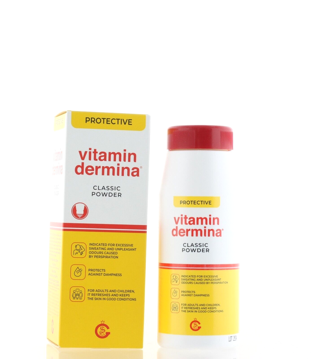 Vitamindermina Powder is a dermatological absorbent body powder that helps keep the skin dry, fresh, and protected.